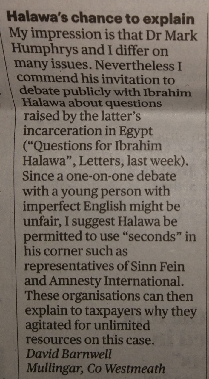 I now challenge Ibrahim to a civilized public debate, where we can thrash out all the issues to do with the case, such as the two appalling figures (Soltan and Morsi) he cited as his leaders in his speech from the stage. Tubridy made a good start, but such an in-depth debate is long overdue.