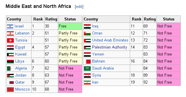 And note that Freedom House are not blindly pro-Israel. They ticked Israel over from 30, the bottom of "Free" in 2012, to 31, the top of "Partly Free" (the middle category) in 2013. Still a long way from the RSF view of the world, though.