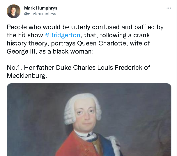 This crank history was mainstreamed by the Netflix show Bridgerton (2020). They doubled down in a spin-off show Queen Charlotte: A Bridgerton Story (2023).